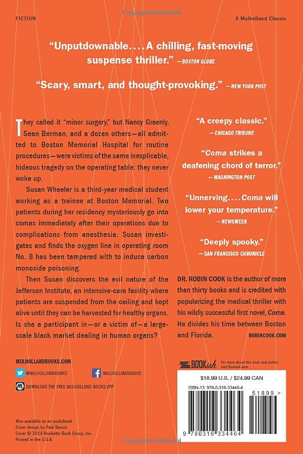 Then Susan discovers the evil nature of the Jefferson Institute, an intensive care facility where patients are suspended from the ceiling and kept alive until they can be harvested for healthy organs. Is she a participant in--or a victim of--a large-scale black market dealing in human organs?