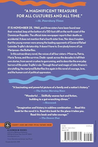 In this extraordinary novel, the voices of all four sisters--Minerva, Patria, María Teresa, and the survivor, Dedé--speak across the decades to tell their own stories, from secret crushes to gunrunning, and to describe the everyday horrors of life under Trujillo’s rule. Through the art and magic of Julia Alvarez’s imagination, the martyred Butterflies live again in this novel of courage and love, and the human costs of political oppression.
