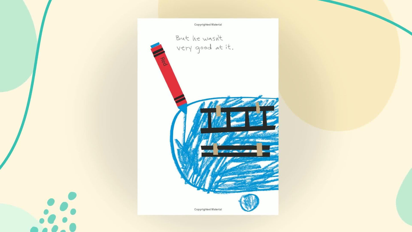 Red has a bright red label, but he is, in fact, blue. His teacher tries to help him be red (let's draw strawberries!), his mother tries to help him be red by sending him out on a playdate with a yellow classmate (go draw a nice orange!), and the scissors try to help him be red by snipping his label so that he has room to breathe. But Red is miserable. He just can't be red, no matter how hard he tries!