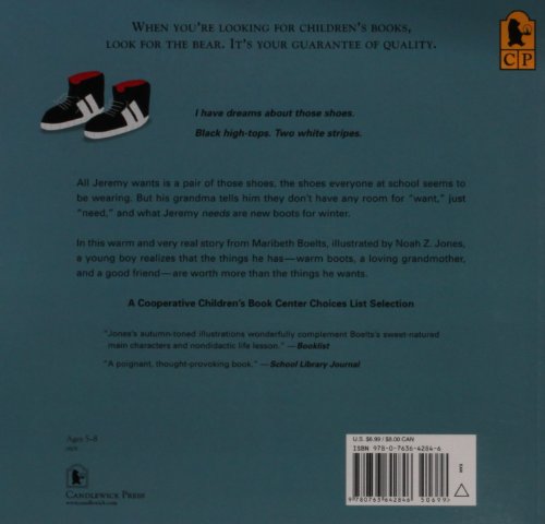 All Jeremy wants is a pair of those shoes, the ones everyone at school seems to be wearing. Though Jeremy’s grandma says they don’t have room for "want," just "need," when his old shoes fall apart at school, he is more determined than ever to have those shoes, even a thrift-shop pair that are much too small. But sore feet aren’t much fun, and Jeremy soon sees that the things he has — warm boots, a loving grandma, and the chance to help a friend — are worth more than the things he wants.