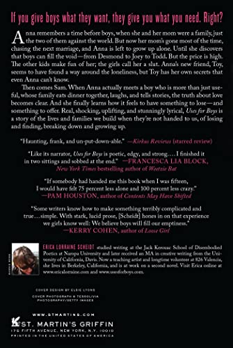 Then comes Sam. When Anna actually meets a boy who is more than just useful, whose family eats dinner together, laughs, and tells stories, the truth about love becomes clear. And she finally learns how it feels to have something to lose―and something to offer. Real, shocking, uplifting, and stunningly lyrical, Uses for Boys by Erica Lorraine Scheidt is a story of breaking down and growing up.